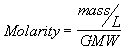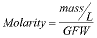 Molar concentrations are expressed as the number of moles of a substance present in one liter volume. A mole is a gram molecular weight (GMW) or more generally, a gram formula weight (GFW) of a substance. This corresponds to the quantity of substance in grams which is equal to the atomic weight of the substance, whether it be an atom, a molecule or an ion. The utility of these units is that one mole contains the same number of atoms, molecules or ions (Avogadro's Number, 6.02x1023) regardless of the identity of the substance. A solution of 1 mole of a substance dissolved in a liter of water (i.e, 1 mole/L) is called a 1 Molar solution, and is said to have a Molarity of one.