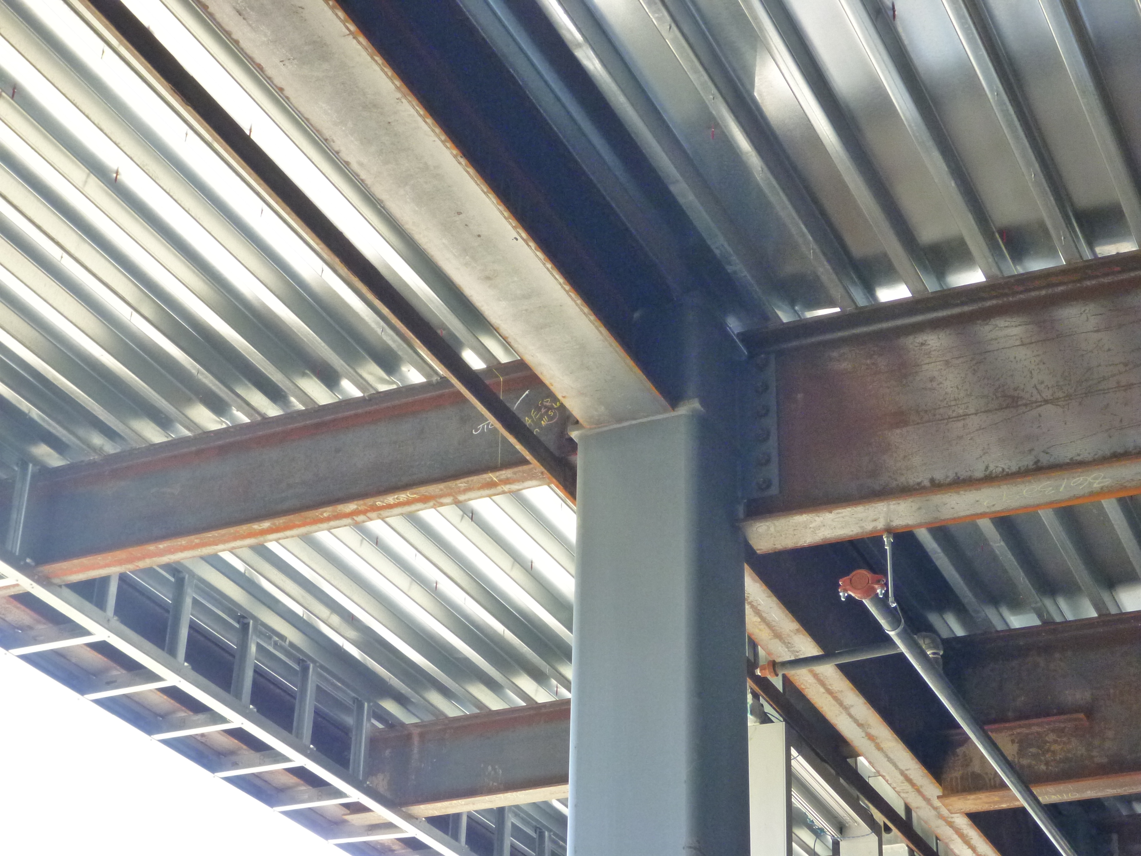 Unusual features are the thermal break at cantilevers and moment connection to an HSS column (moment in and out of page, pin connection left to right) shown below.