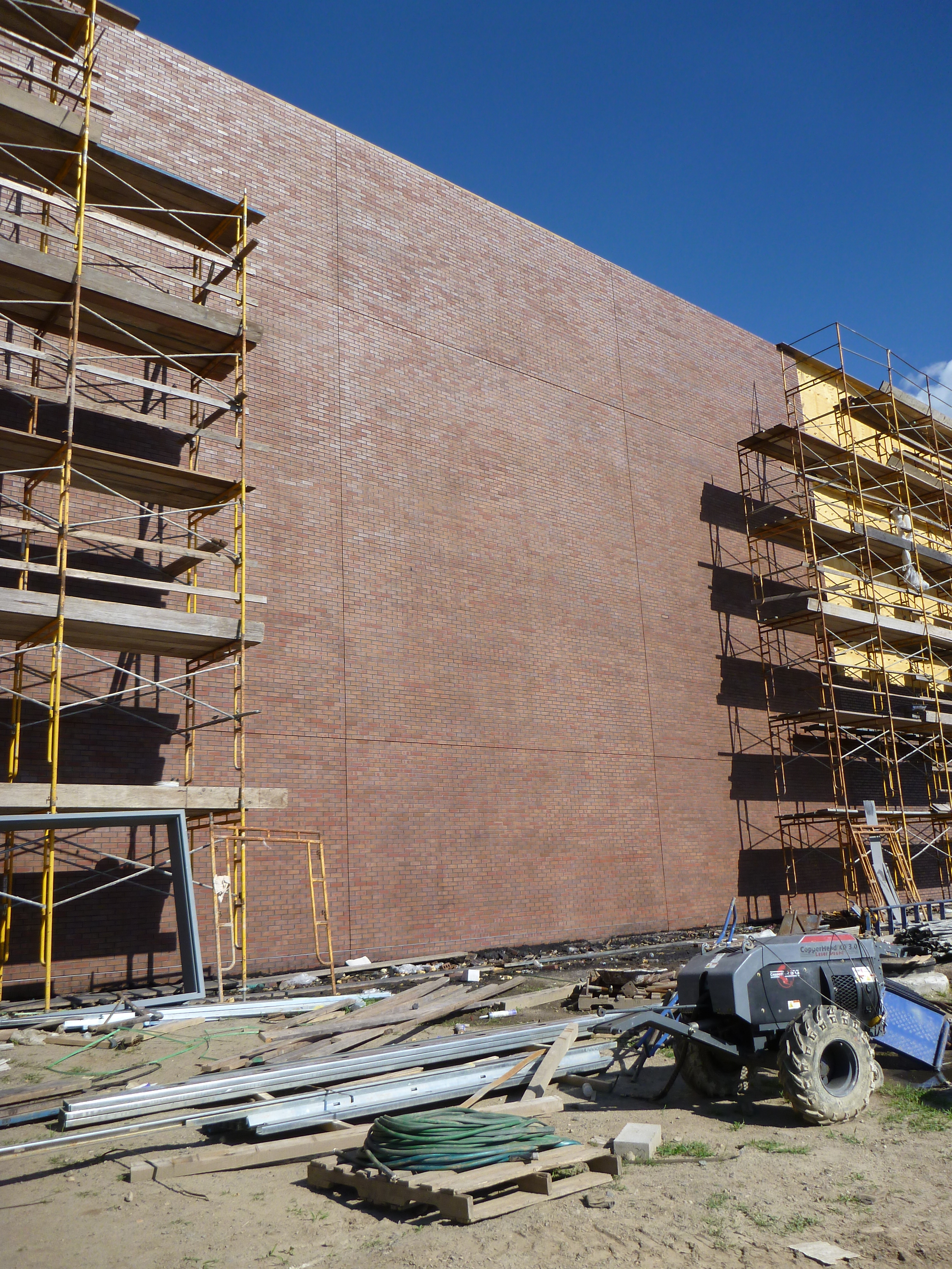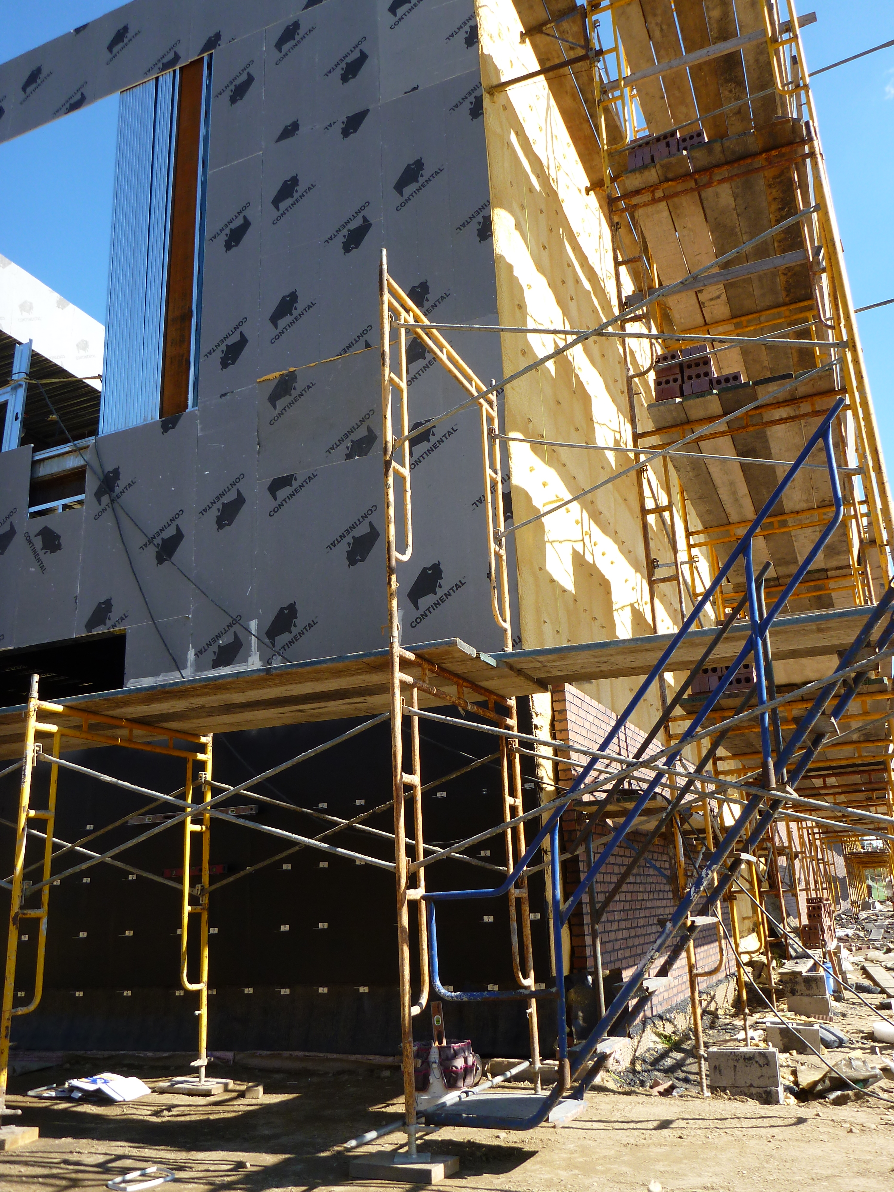 Finally the cladding details can be clearly seen in the construction photos below. Note the gap behind the brick facade for air flow and drainage and the regular expansion joints on the completed facade - a clear indication that it is a facade rather than a masonry structural system.